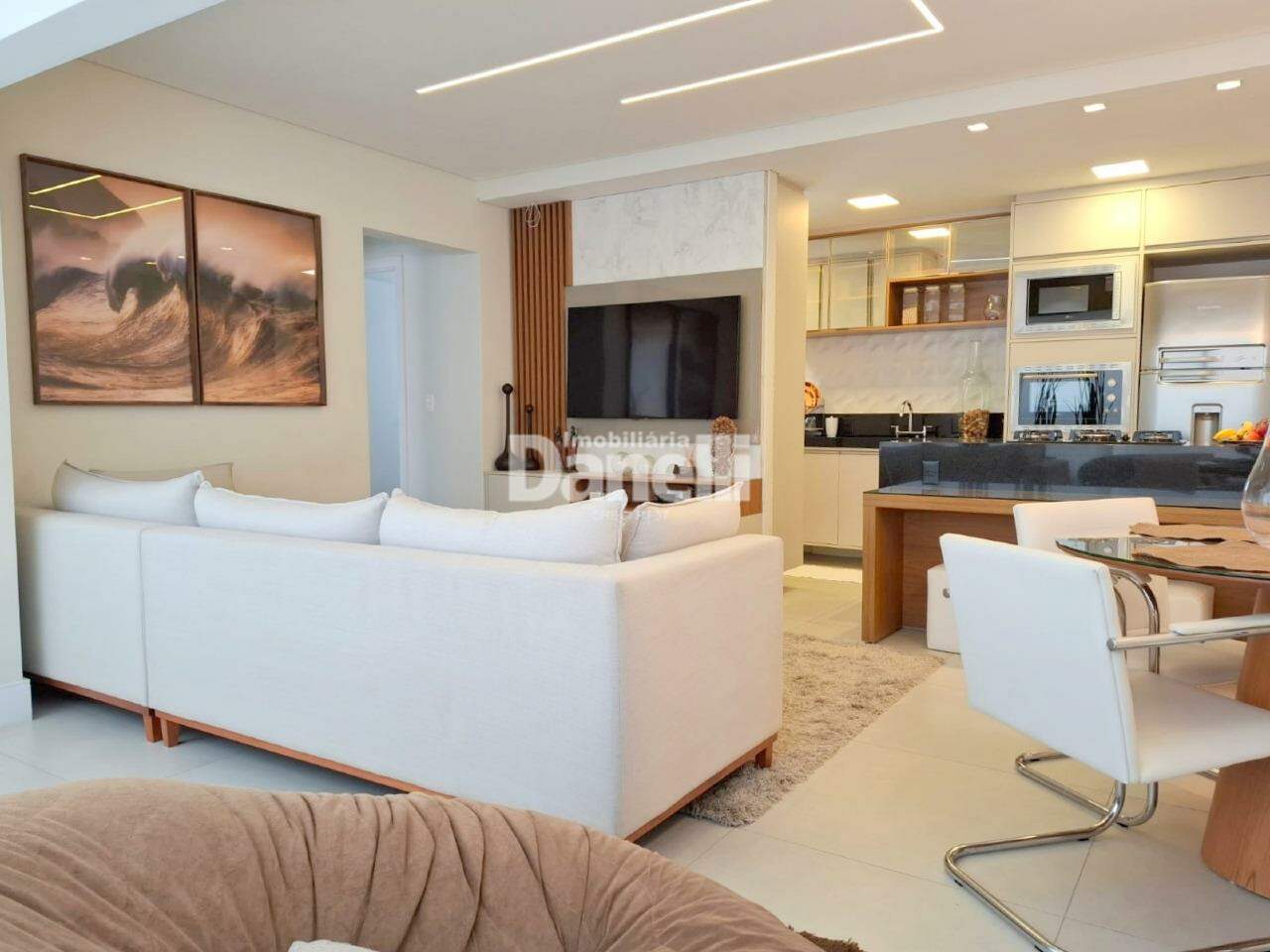 Acabamentos sofisticados e modernos em tons neutros, trazendo maior elegância ao imóvel que possui conceito aberto integrando cozinha, sala e varanda gourmet com vidro.